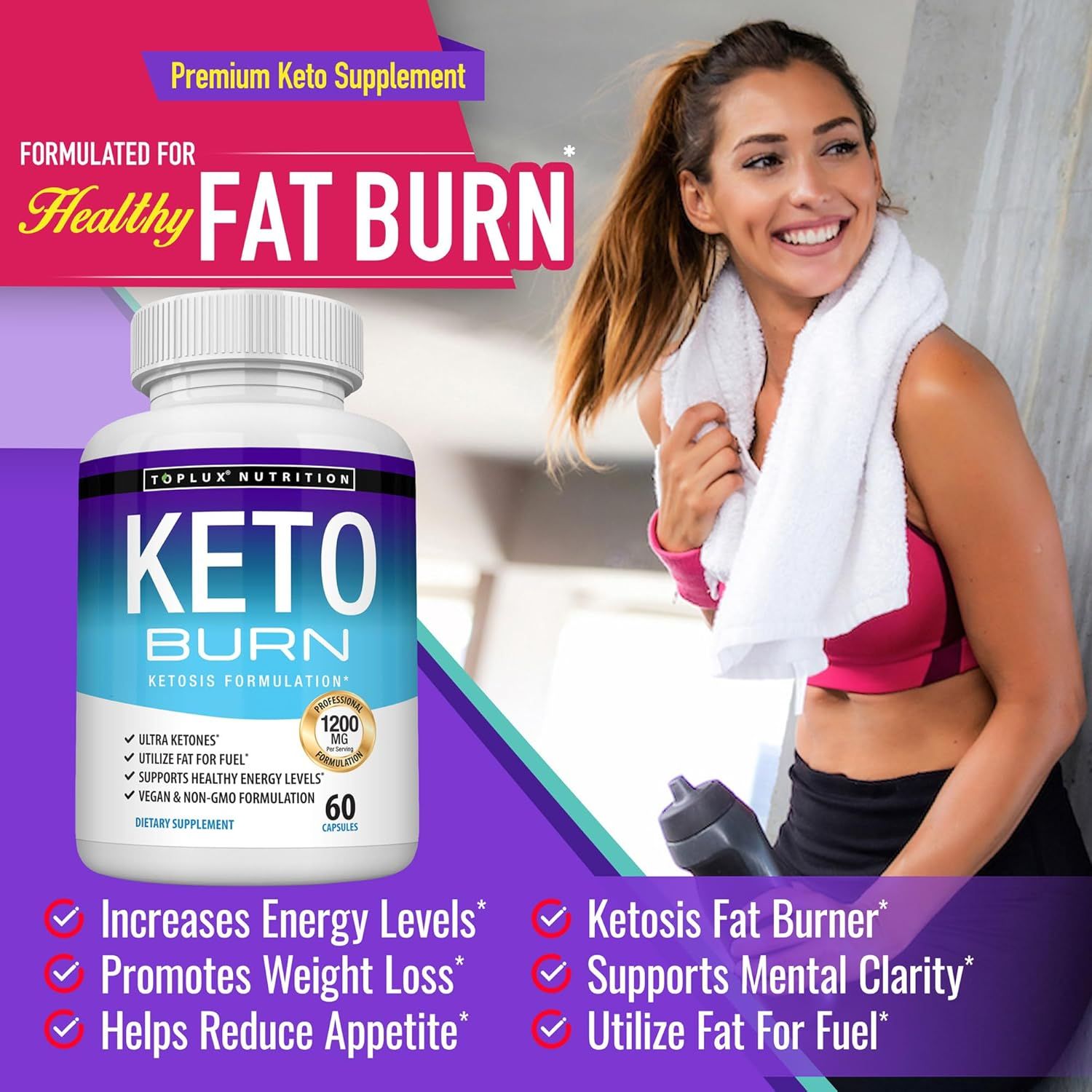 Natural Keto Burn Supplement is an advanced, all-natural ketogenic fat burner designed to support weight management and enhance energy during a keto diet. Formulated with natural ingredients including raspberry ketones, it helps your body enter ketosis, utilizing fat for fuel while providing sustained energy. Made in a GMP-certified USA facility, this supplement comes in a 60-capsule bottle for convenient daily use alongside meals and workouts. Perfect for anyone starting or maintaining a keto lifestyle, it combines science-backed ingredients with premium quality for effective weight loss support.